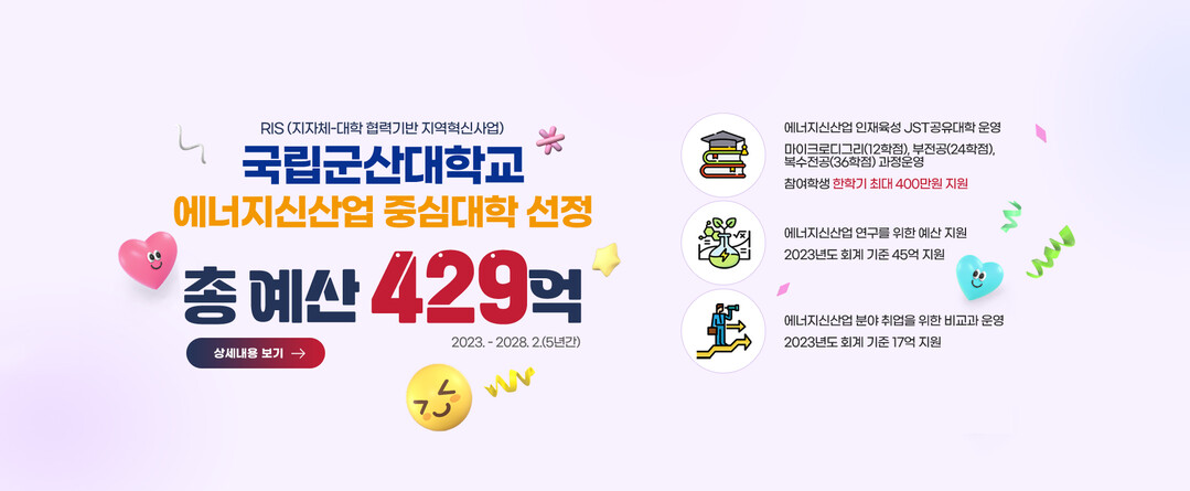 국립군산대는 2023년도부터 전북지역 지자체-대학 협력기반 지역혁신사업에서 에너지신산업분야 중심대학으로 선정돼 5년간 429억 원의 예산으로 전북지역 에너지신산업 기업 및 8개 참여대학에 지원하고 있다.