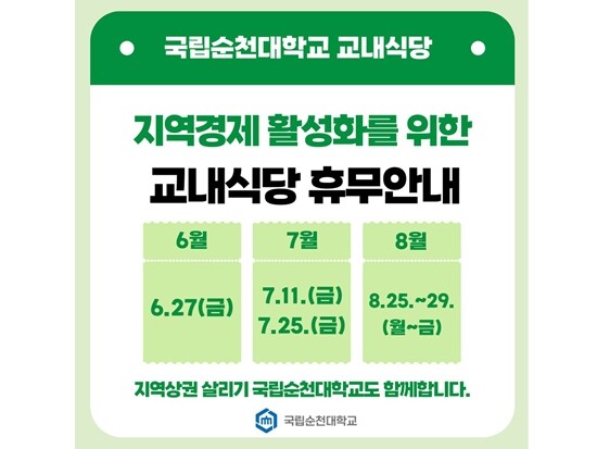 [대학저널 온종림 기자] 국립순천대학교가 지역 상권과의 상생을 위해 6월부터 8월까지 매월 1회 이상 교내식당 휴무를 시행한다.