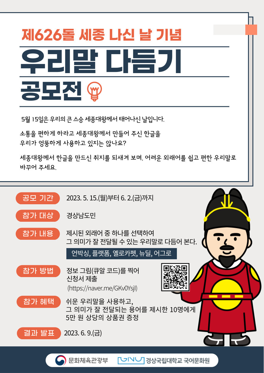 [대학저널 온종림 기자] 경상국립대학교는 국어문화원이 제626돌 세종 나신 날(5월 15일)을 맞아 ‘세종 나신 날 기념 우리말 다듬기 공모전’을 한다고 17일 밝혔다.