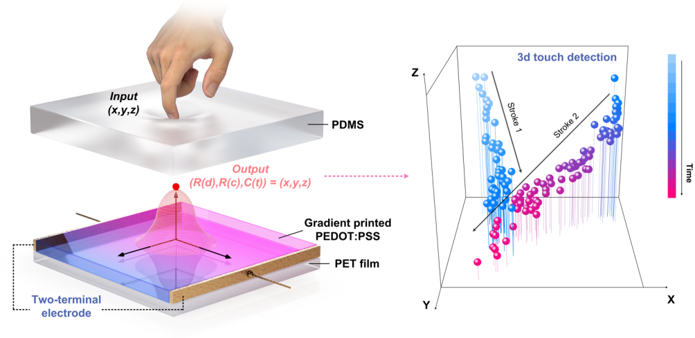 심우영 교수팀은 특별한 전도성 재료와 축전기(Capacitor)의 충전 시간을 활용해 단 두 개의 단자만으로 정확한 터치 위치를 감지하는 방법을 개발했다. 이 센서는 잉크젯 프린팅을 활용, 간편하게 제작될 수 있어 대량 생산에 유리하다. 특히, 3D 터치 기능 외에도 투명하게 작동하며, 구부리거나 접을 때의 성능 저하가 없다는 장점을 갖추고 있다.