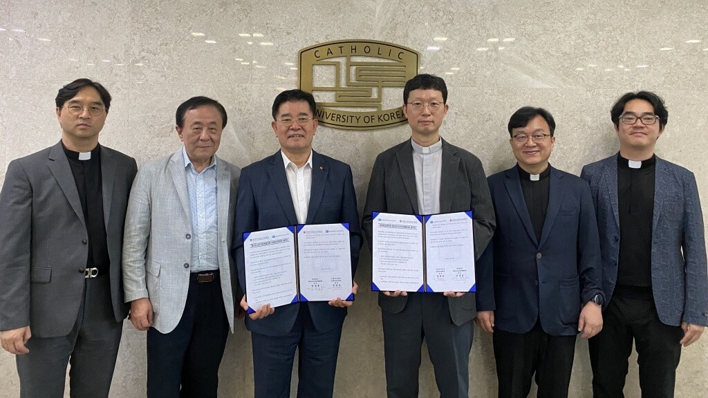 가톨릭대 문화영성대학원(원장 정태영 신부, 오른쪽에서 3번째)과 한국천주교 평신도사도직협의회(회장 안재홍, 왼쪽에서 3번째)가 평신도 지도자 양성을 위한 MOU를 맺었다. 사진=가톨릭대 제공 |