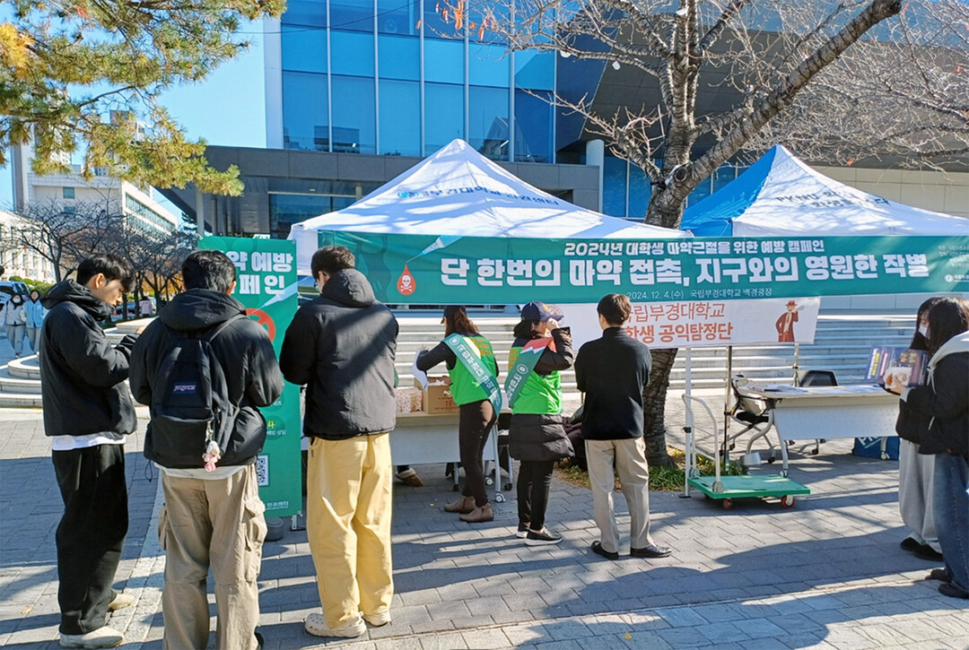 이번 캠페인에는 국립부경대 경찰범죄심리학전공 학생들이 직접 자원봉사자로 참여해 최근 대학가에 공공연히 유포되고 있는 마약의 위험성에 대한 정보를 제공하고 경각심을 높이는 등 대학생들에게 마약의 심각성을 알렸다.