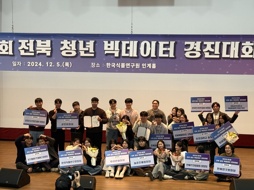 전북 청년 빅데이터 경진대회는 전북 빅데이터 기술교류 공동 연구회, 전북대 빅데이터 혁신융합대학사업단에서 주최했으며, 공공데이터를 활용한 창의적인 아이디어 기획 부문 및 지역 또는 사회 현안 문제해결 부문에 총 30팀이 출품하여 전문가 심사를 거쳐 진행됐다.