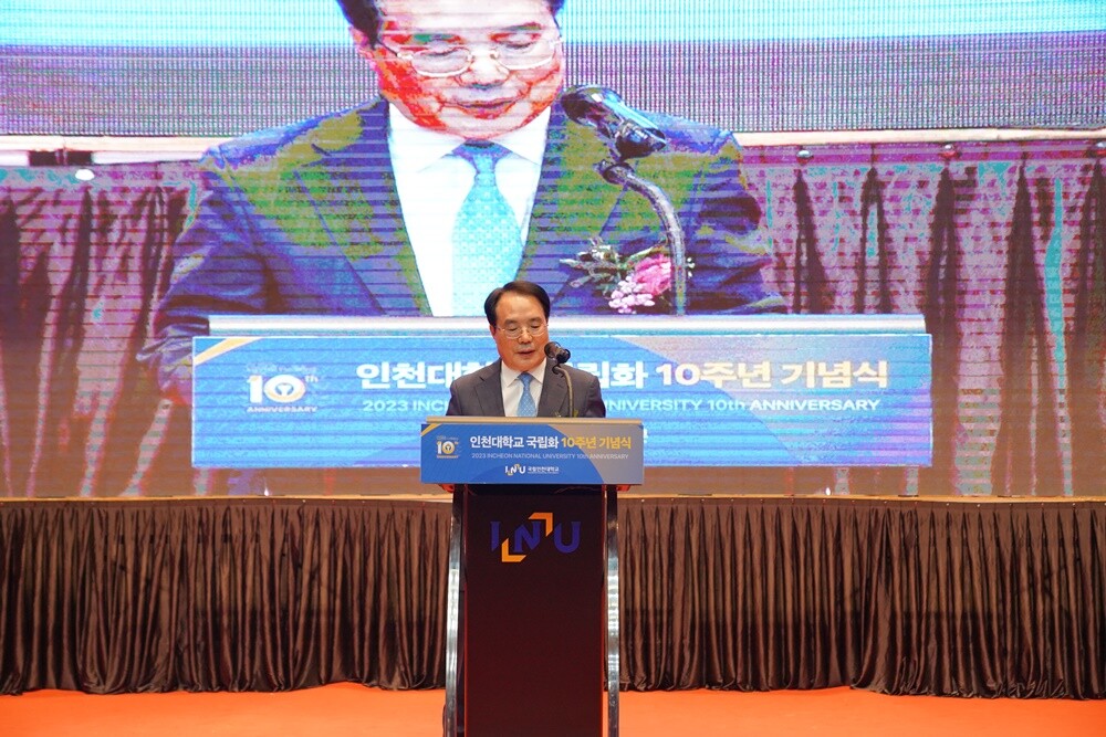 인천대 박종태 총장이 28일 국립화 10주년 기념식에서 기념사를 하고 있다. 사진=인천대 제공