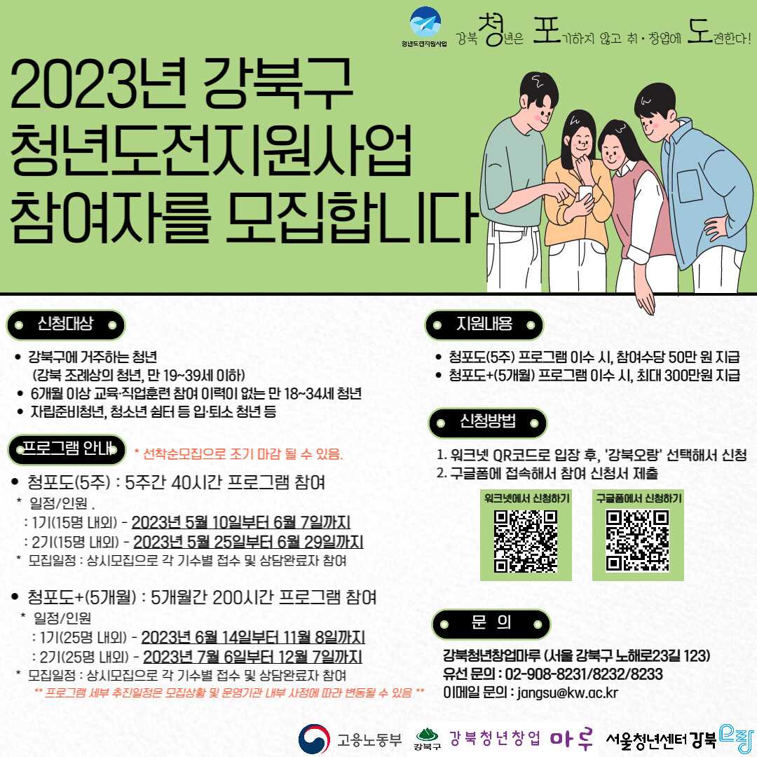 강북구는 ‘강북 청년은 포기하지 않고 취·창업에 도전한다.’는 목표로 일명 ‘청포도’(청년도전지원사업) 프로그램을 진행한다.