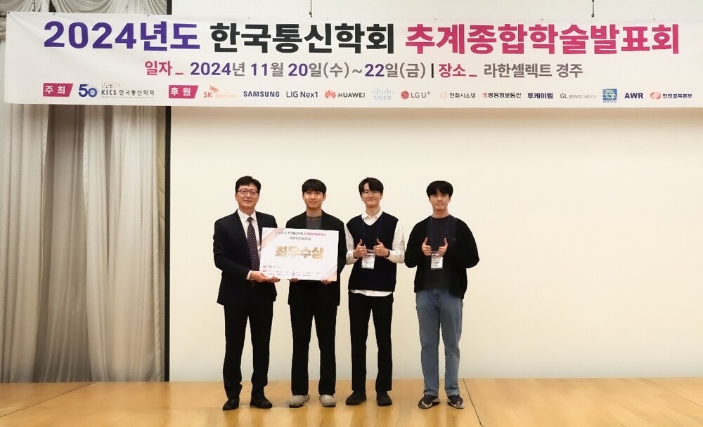 지난 11월 20일부터 22일까지 라한셀렉트경주에서 열린 한국통신학회 추계종합학술발표회에서 로봇공학과 박영호, 임효진(4학년) 학생, 우용택(석사과정) 학생이 ‘터널 내 자동차 램프를 활용 및 확장 가능한 Li-Fi 기반 체인 방식: 속도 및 가속도 데이터 전송을 통한 연쇄추돌 및 급정거 방지’를 주제로 공동 저술한 논문이 학부 논문 117편 중 최우수 논문으로 선정됐다.