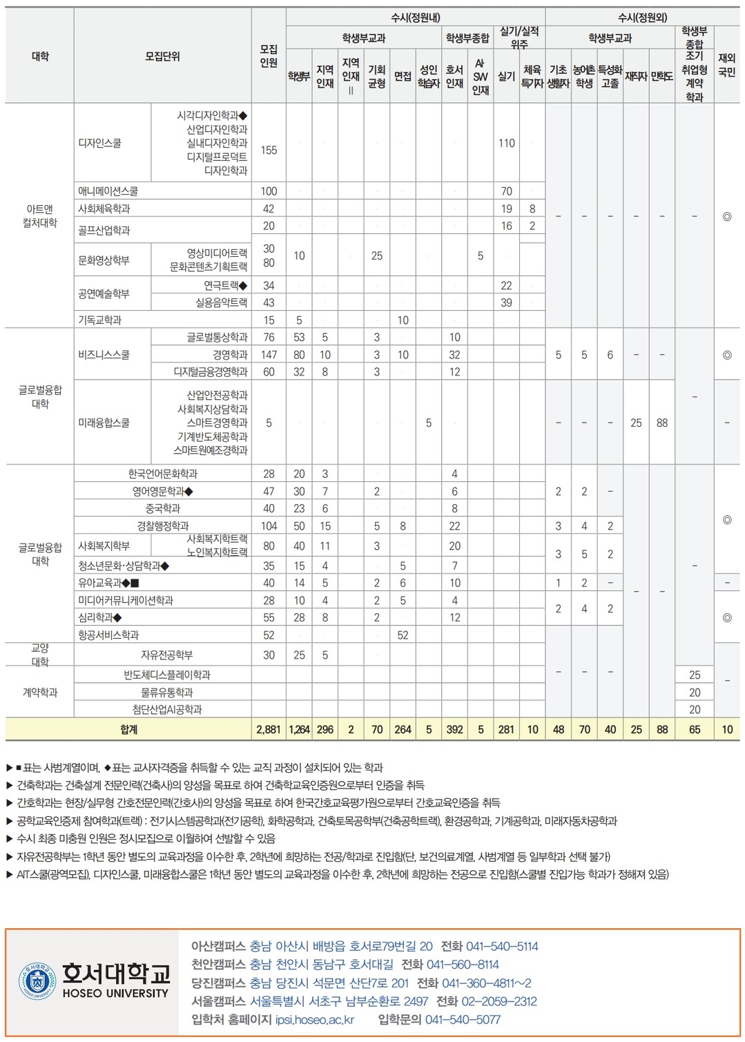 호서대는 2026학년도 신입학 수시모집에서 2,589명(정원내)을 모집한다. 수시전형은 크게 학생부교과전형, 학생부종합전형, 실기위주전형으로 나뉘며 모든 전형과 모집단위에서 수능최저학력기준은 없다.