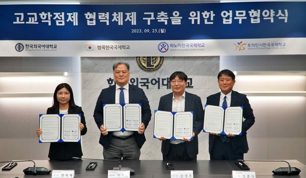 [대학저널 온종림 기자] 한국외국어대학교가 25일, 서울캠퍼스 대학본부 이덕선 회의실에서 방콕한국국제학교, 하노이한국국제학교, 호치민시한국국제학교와 고교학점제 협력체제 구축을 위한 업무협약을 체결하였다.