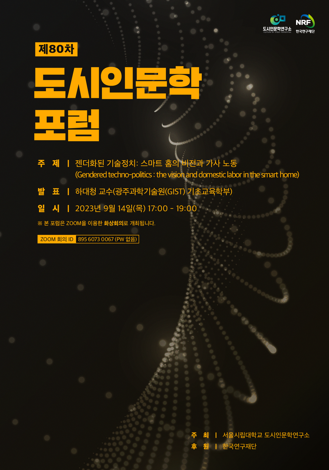 이번 포럼에서는 스마트 홈이 약속하는 가사 노동 해방의 신화를 살피고, 기술적 해결책으로 마무리되기보다는 젠더화된 가사노동의 배분 방식에 대한 새로운 논의의 필요성을 제시하는 발표와 심도 높은 토론을 진행하고자 한다. 강연자로는 광주과학기술원(GIST)의 하대청 교수가 나서며 스마트 홈의 기술정치를 살펴본다.