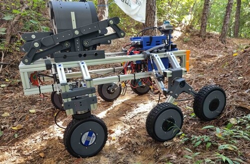 한기대 ‘2025 졸업작품 경진대회’에서 대상을 수상한 메카트로닉스공학부 가제트팀의 ‘드론 배터리 자동 교체 플랫폼을 탑재한 산악 지형 잔불 진화 로봇’. 사진=한기대 제공 |
