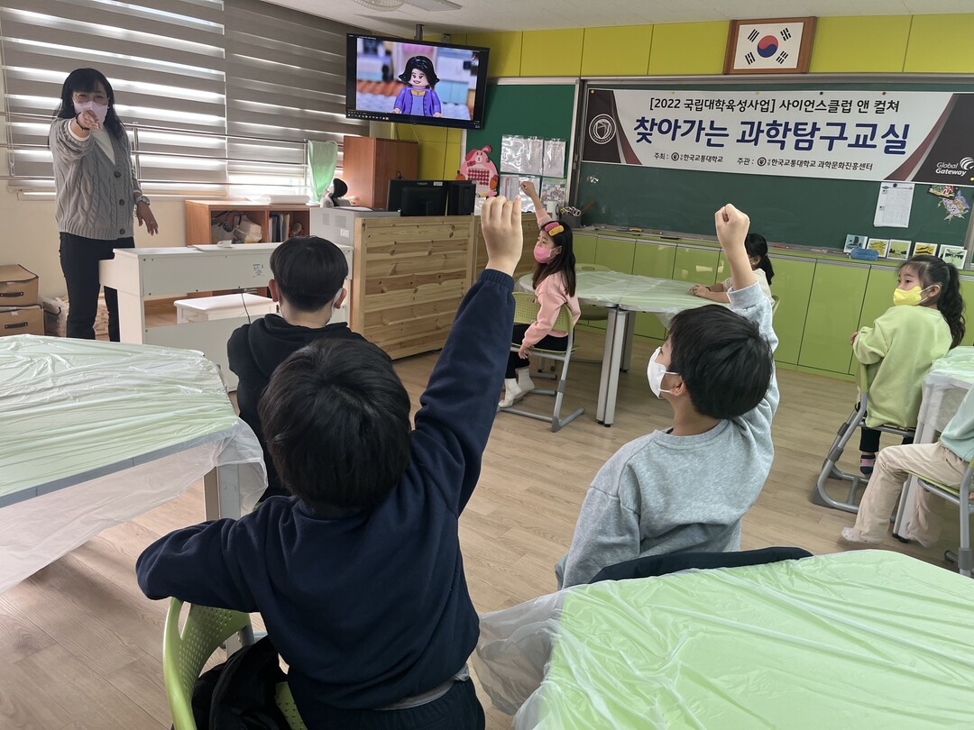 | 한국교통대 과학문화진흥센터가 주최한 '돌봄아동을 찾아가는 과학탐구교실'에서 학생들이 손을 들고 질문에 답하고 있다. 사진=한국교통대 제공 |