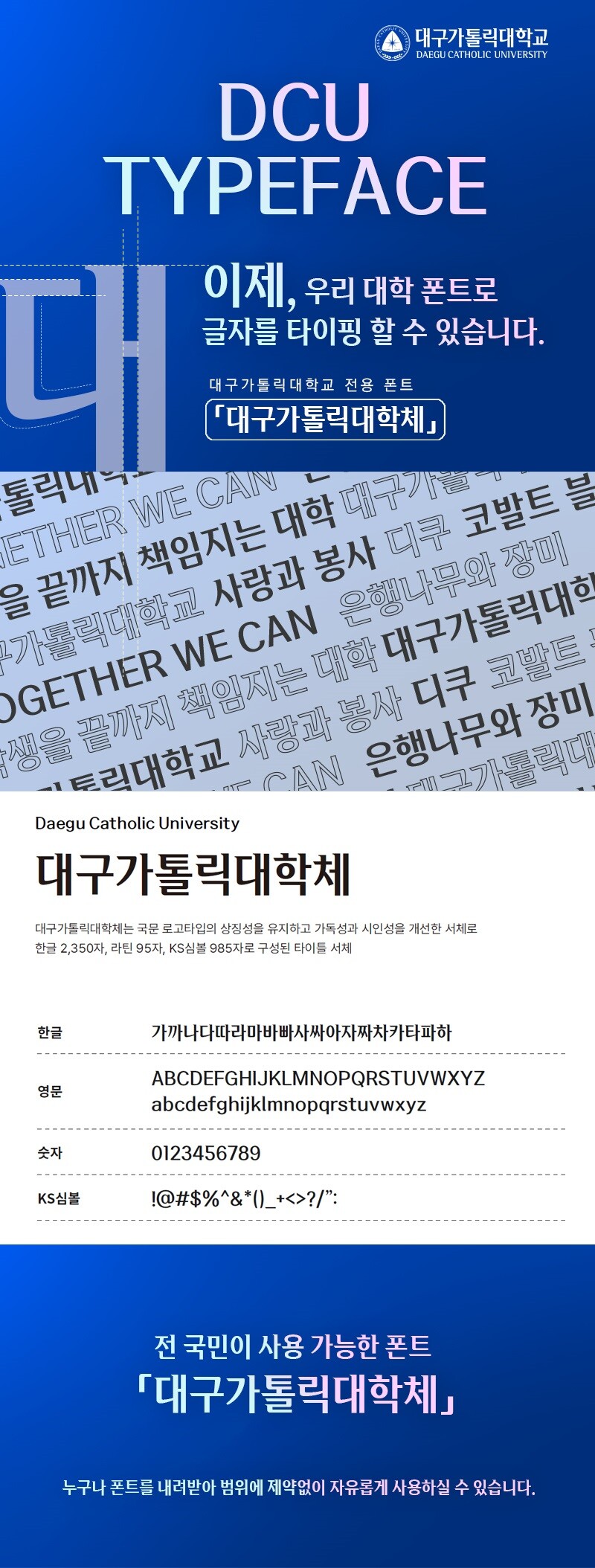 특히, 대구가톨릭대학체는 대학 구성원뿐만 아니라 전 국민 누구나 자유롭게 사용할 수 있도록 제한 없이 제공된다. 상업적·비상업적 용도를 포함해 사용 대상과 범위에 제약이 없으며, 대구가톨릭대 대표 홈페이지를 통해 무료로 내려받고 이용할 수 있다.