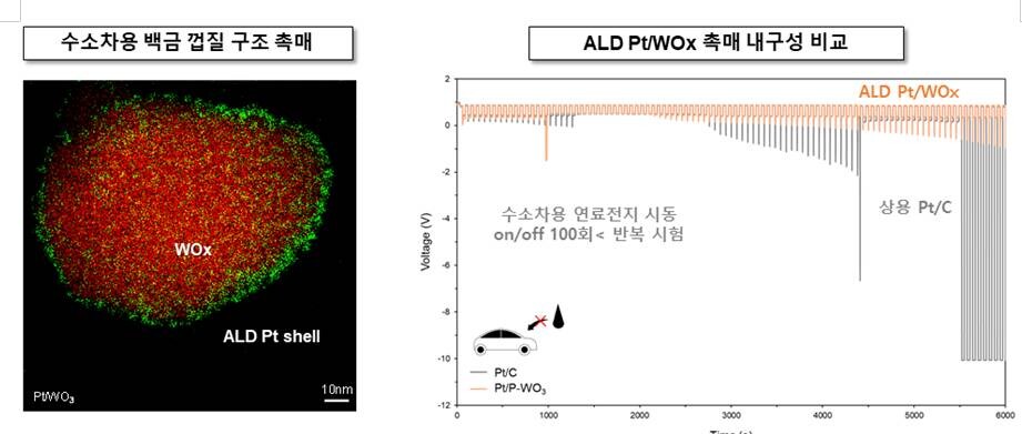 특히, 연구팀은 내구성이 좋은 텅스텐 산화물(WOx)를 백금 지지체로 사용하면 내구성이 획기적으로 향상됨을 확인했다. 수소차 구동을 모사하여 연료전지 시동을 100회 이상 켜고 끄는 것을 반복했을 때, 상용 탄소 지지체 상 백금은 대부분 촉매 기능을 상실한 반면 ALD Pt/WOx 촉매는 성능 변화가 거의 없음을 밝혀냈다.