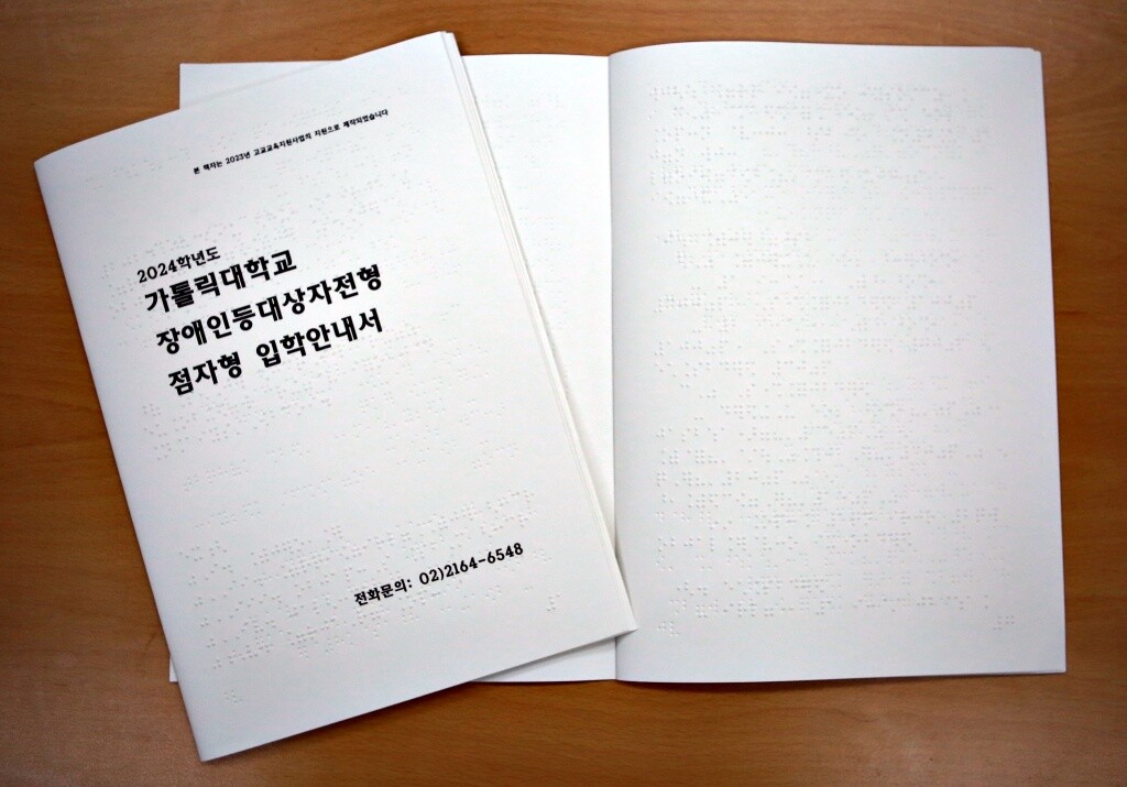 올해는 시력 또는 시야 결손으로 모집요강을 읽기 어려운 중증·경증 시각장애인 수험생이 입시 정보에서 소외되는 경우가 많은 것을 고려해, 점자형 대입전형 안내책자를 신규 제작하게 됐다. 가톨릭대는 2024학년도 대입전형 안내와 학과, 장애학생지원제도 안내 등을 상세히 담은 점자형 책자를 전국 모든 맹학교에 배포했다.