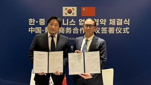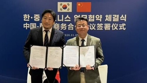 더크로싱랩 신지호 대표이사(왼쪽)와 중관촌기업주한국서울서비스대표처 Zhang Zhang(张璋) 비서장이MOU 체결 후 협약서를 들고 기념촬영을 하고 있다. |