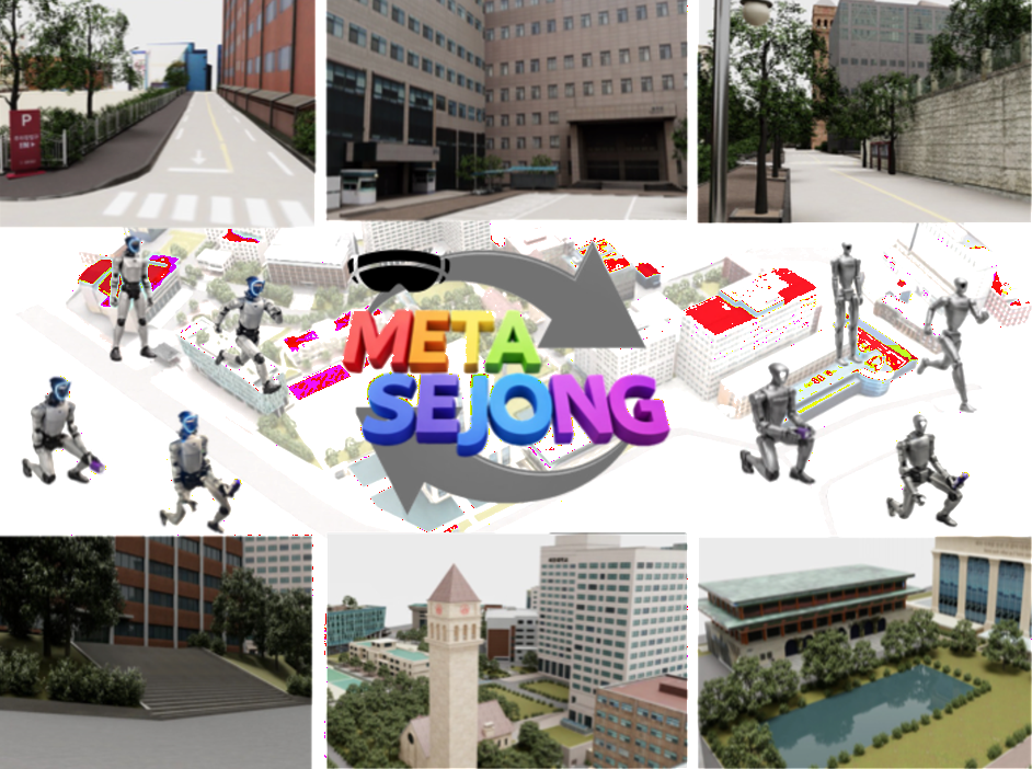 세종대 캠퍼스 디지털 트윈 기반 ‘Meta‑Sejong 플랫폼’ 및 로봇 시뮬레이션 개념도. |