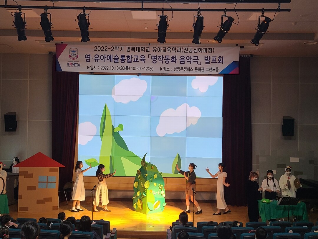 이번 발표회는 유아교육학과 '영유아예술통합교육' 교과목을 수강한 75명의 전공심화과정 학생들이 재구성한 창의적인 수업 결과물로 빨간 모자, 브레멘 음악대 등 6개의 명작동화를 음악극으로 공연했다.