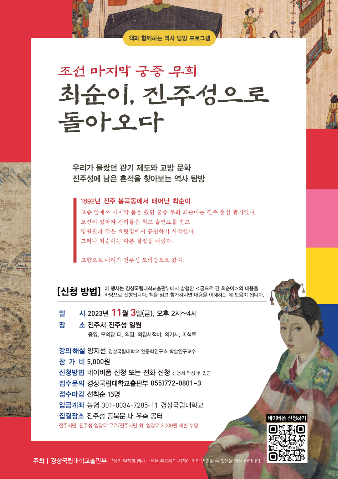 [대학저널 이선용 기자] 경상국립대학교 출판부가 11월 3일 진주성에서 ‘조선 마지막 궁중 무희 최순이, 진주성으로 돌아오다’라는 주제로 진주 관기의 흔적을 찾는 진주성 탐방 행사를 개최한다.