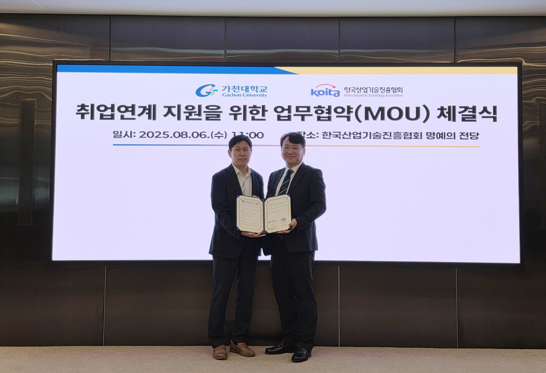 [대학저널 이선용 기자] 가천대학교 대학일자리플러스센터가 지난 6일 한국산업기술진흥협회와 이공계 미취업 졸업생의 취업 지원을 위한 업무협약을 체결했다. 협약식은 서울 양재동에 위치한 산기협회관 IR52 장영실상 명예의 전당에서 진행됐다.
