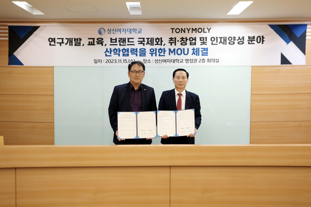 [대학저널 이선용 기자] 성신여자대학교가 15일 글로벌 뷰티 브랜드 토니모리와 뷰티산업 관련 연구 개발, 브랜드 국제화, 전문 인재 양성 등의 산학협력을 위한 업무협약을 체결했다.