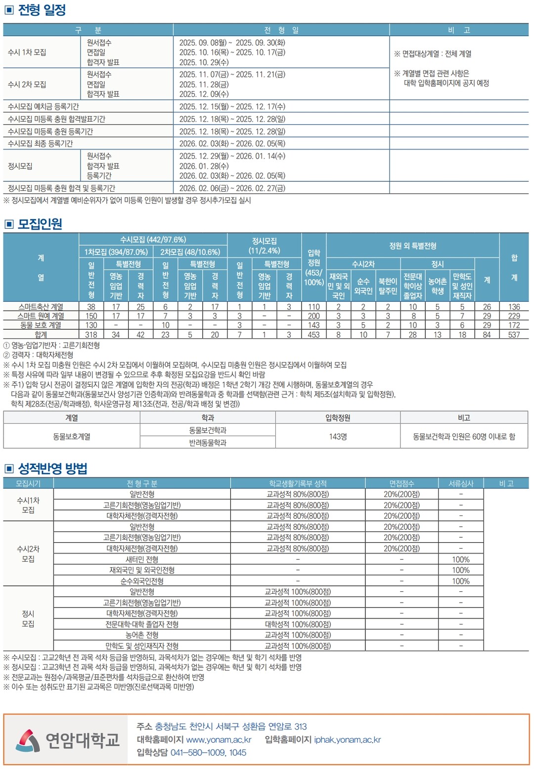 또한 수시 모집은 교과 성적(고교 2학년 전 과목 석차 등급) 80%와 면접 20%를 반영한다. 여기서 교과 성적의 경우 등급별 점수 차가 크지 않은 면이 있다. 따라서 연암대에 합격을 희망하는 학생은 면접 준비를 충실하게 하는 것이 중요하다.