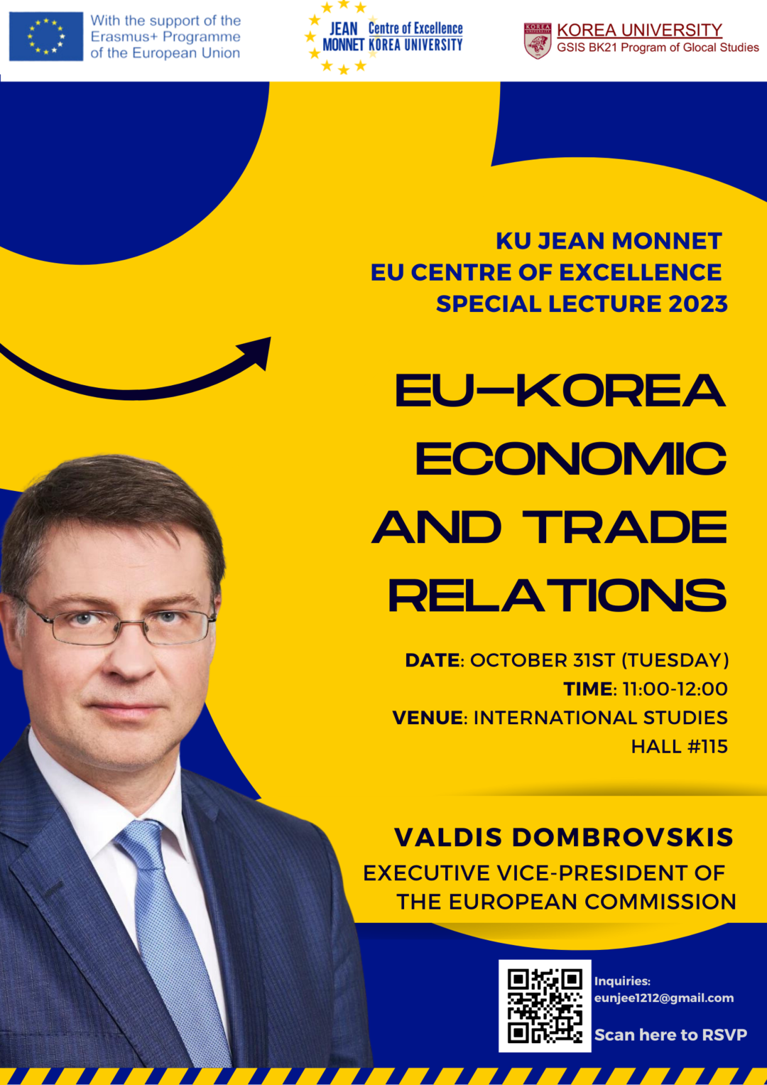 고려대학교 장 모네 EU 센터는 10월 31일 오전 11시 고려대 국제관 115호실에서 발디스 돔브로브스키스 EU 수석 부집행위원장을 초청하여 ‘한-EU 경제 통상 관계’라는 주제로 특별 강연을 진행한다고 25일 밝혔다.