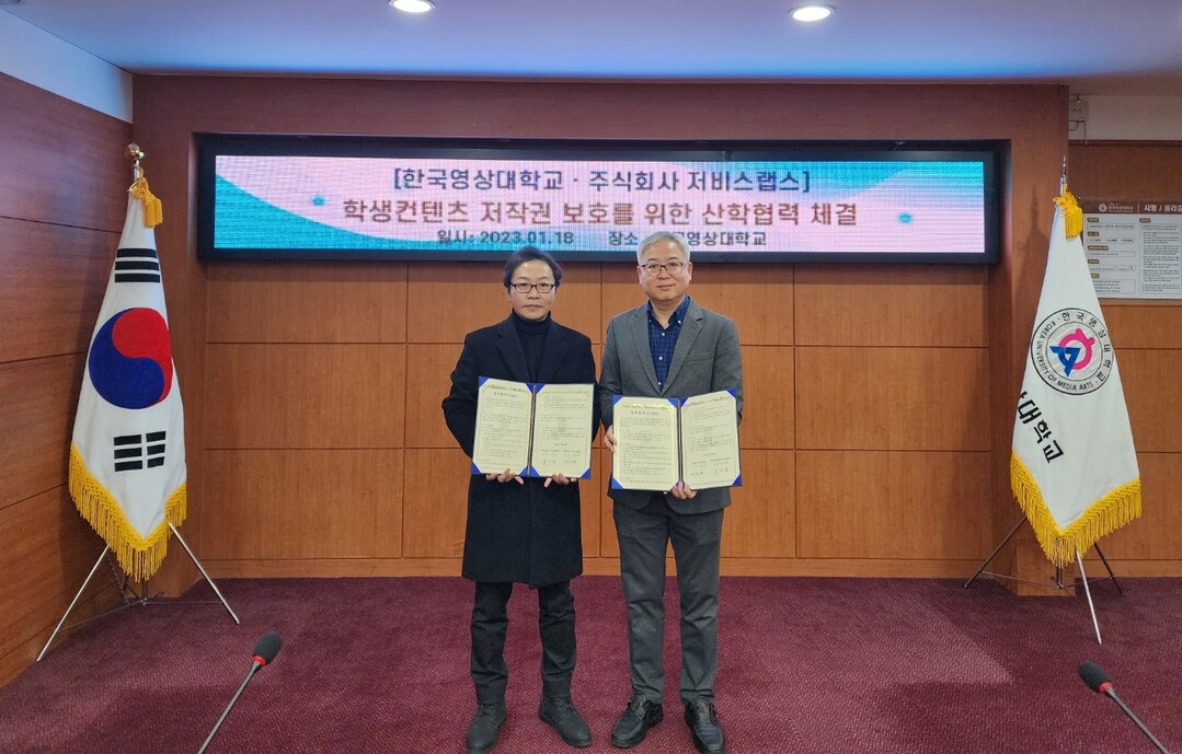 유세문(왼쪽) 한국영상대 교수와 정석현 저비스랩스 대표가 지난 18일 학생 콘텐츠의 저작권 보호를 위한 업무협약을 체결한 뒤 협약서를 펼쳐보이고 있다. 사진=한국영상대 제공 |