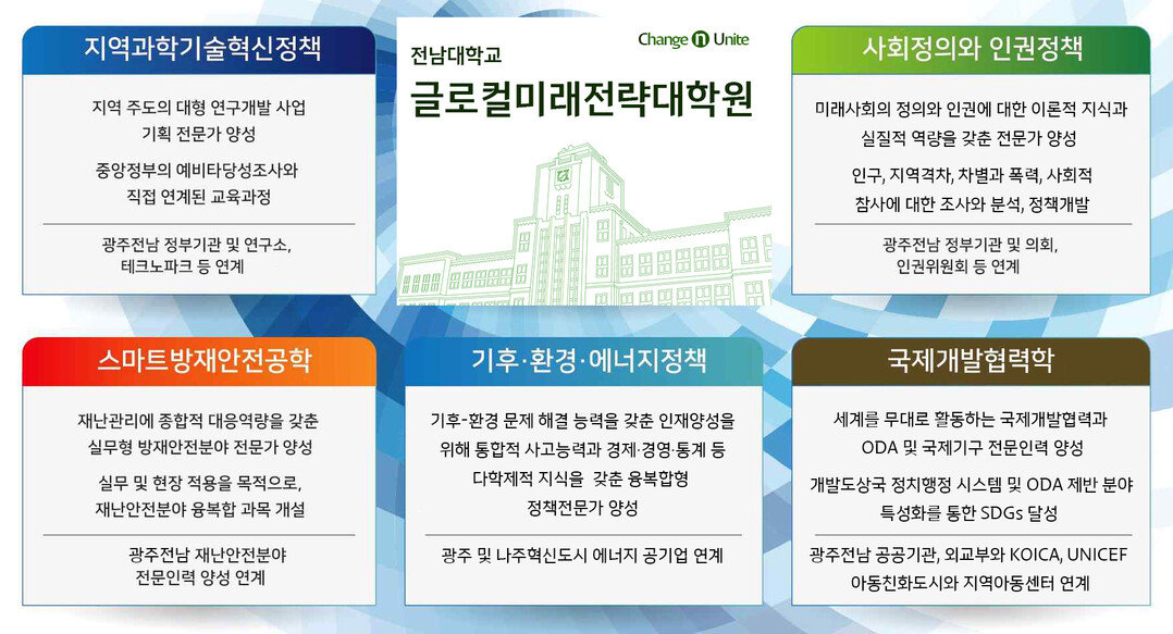 글로컬 대학원은 이같은 미래전략전문가 양성을 위해 기후·환경·에너지정책, 사회정의와 인권정책, 국제개발협력, 지역과학기술혁신정책, 스마트방재안전공학 등 전공으로 다섯 분야로 나눈다.