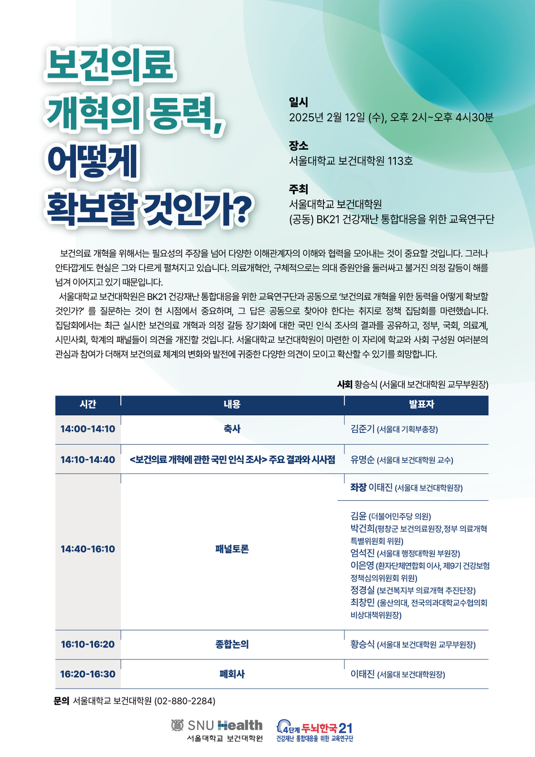 서울대학교 보건대학원은 『BK21 건강재난 통합대응을 위한 교육연구단』과 공동으로 ‘보건의료 개혁을 위한 동력을 어떻게 확보할 것인가?’를 주제로 하는 정책 집담회를 개최한다.
