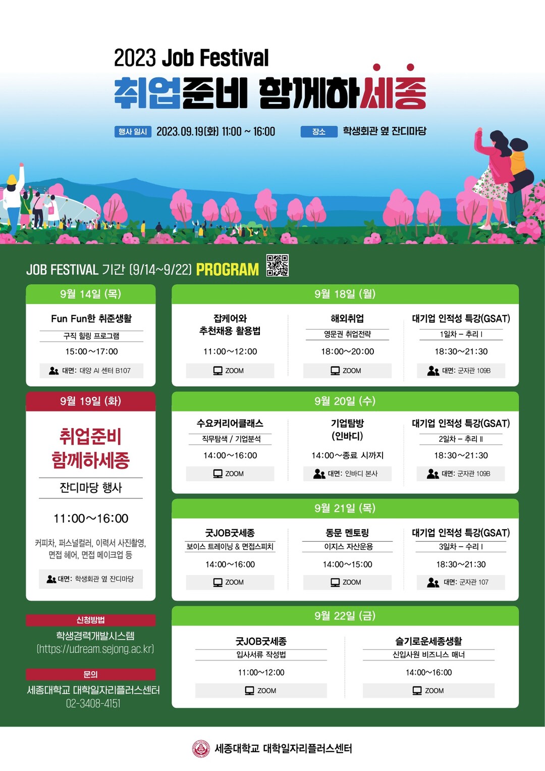 19일 학생회관 옆 잔디마당에서 열리는 ‘2023 Job Festival 취업준비 함께하세종’에서는 ▲면접 이미지메이킹(퍼스널 컬러, 면접 헤어, 면접 메이크업) ▲이력서 사진 촬영 ▲캘리그라피 ▲취업 소원 작성하기 ▲대학일자리플러스센터 프로그램 및 추천채용 홍보 ▲고용노동부 정책 홍보 등의 다양한 이벤트가 진행된다.