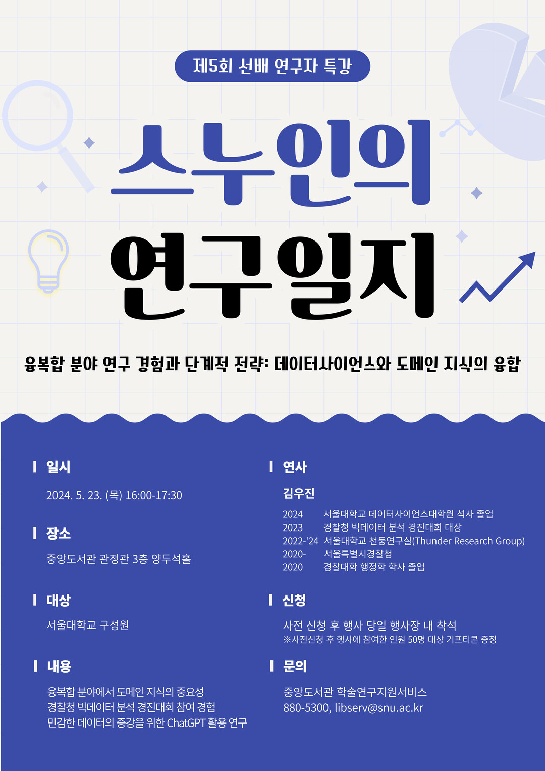 [대학저널 이선용 기자] 서울대학교 중앙도서관이 5월 23일 오후 4시부터 중앙도서관 관정관 양두석홀에서 제5회 선배 연구자 특강 ⌜스누인의 연구일지⌟를 개최한다.