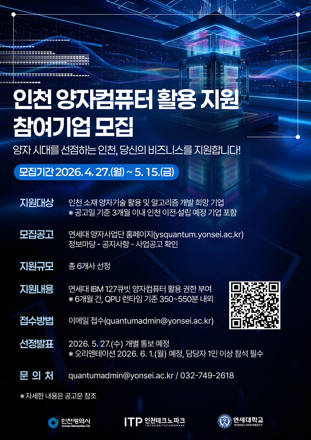 지원 대상은 공고일 기준 인천시에 소재하거나 3개월 이내에 인천으로 이전·설립 예정인 기업으로, 양자 기술을 통해 비즈니스 모델을 혁신하고자 하는 곳이면 제한 없이 지원 가능하다.