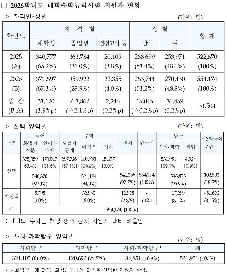 [대학저널 이선용 기자] 오는 11월 13일 시행되는 2026학년도 대학수학능력시험에는 총 554,174명이 지원한 것으로 나타났다. 올해 수능 지원자는 전년 대비 31,504명 증가했다.