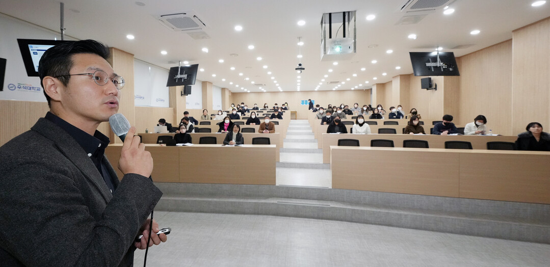 우석대에서 열린 '2022학년도 우석 미래 교육 포럼' 중 관계자가 마이크를 들고 설명하고 있다. 사진=우석대 제공
