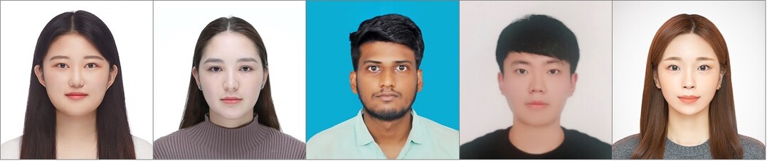 왼쪽부터 이예령 석사과정, 탈신 베질다예바 박사과정, 순다르 라잔 아카시 프라부 박사과정, 정시언 석박통합과정, 안희은 석사과정. 사진=경상국립대 제공 |