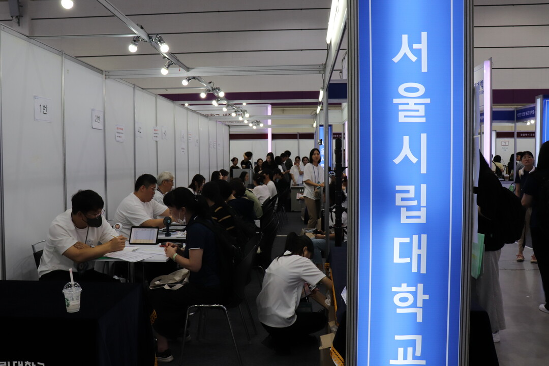 2025학년도 수시 대학입학정보박람회는 지역 거점 국·공립대학, 수도권 대학 등 전국 149곳이 참가했으며, 수험생들은 대학별 입학전문가와 일대일 맞춤형 상담 진행할 수 있다. 사진은 서울시립대학교 부스에서 입시 상담을 받고 있는 수험생들의 모습이다.