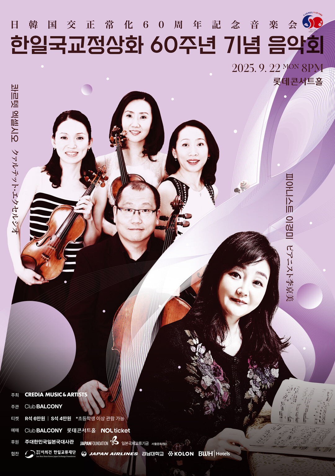 한일국교정상화 60주년을 기념하고, 음악을 통해 양국의 우정과 상생의 메시지를 전할 이번 공연에는 2년 전 ‘한일우정음악회’를 통해 국내 관객과 인연을 맺은 일본 대표 현악 4중주단 ‘콰르텟 엑셀시오’가 함께 무대에 오른다.