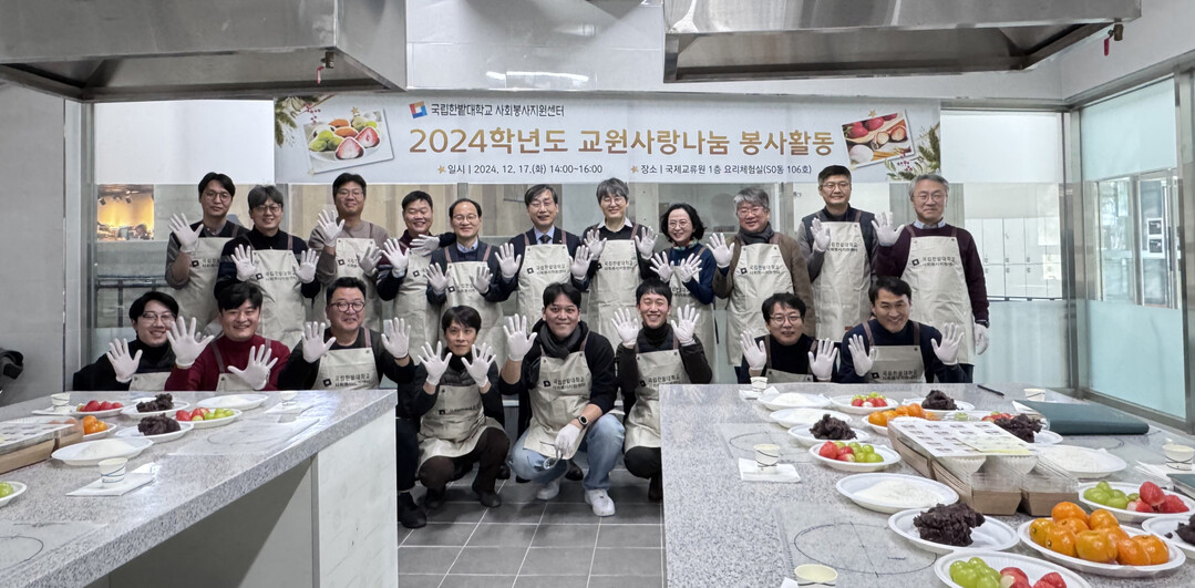 [대학저널 이선용 기자] 국립한밭대학교는 12월 17일 연말을 맞아 오용준 총장과 보직교수 등 21명의 교원 자원봉사자들이 참여한 가운데 색색의 과일 찹쌀떡을 직접 만들어 기부하는 교원 사랑나눔 봉사활동을 실시했다.