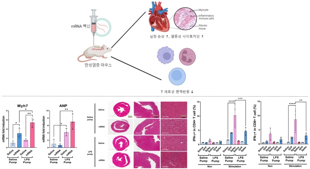 만성 염증을 가진 실험용 쥐에 mRNA 백신을 접종한 결과(위), 작은 펌프를 실험용 쥐에 심은 후 한 달 동안 염증물질(LPS)을 천천히 체내에 방출되도록 하는 만성 염증 모델을 만든 후 mRNA 백신을 2회 접종한 결과, 심장 손상 표지자(Myh7, ANP)가 증가하고 심장에 염증 세포가 더 침투되었으며, IFN-γ분비 T 세포 역시 감소함(아래). |