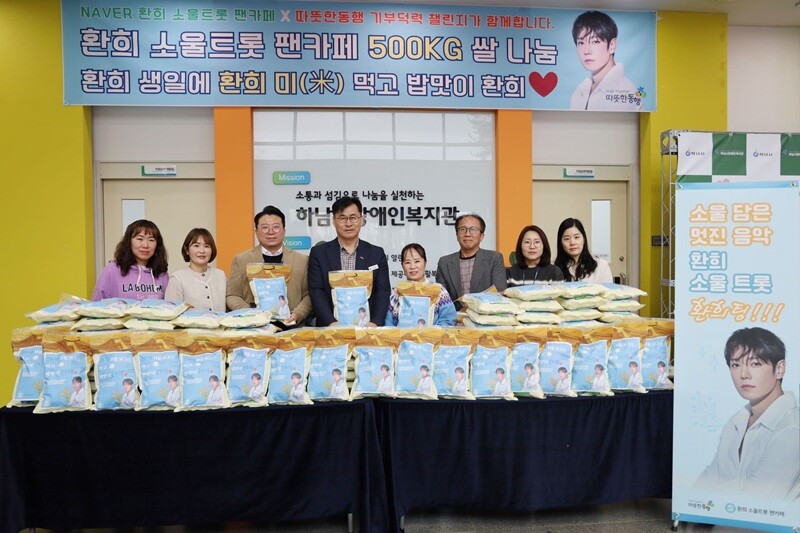 ‘네이버 환희 소울트롯 팬카페’가 가수 환희의 생일을 기념해, 따뜻한동행과 함께 진행한 ‘기부덕력 챌린지’ 캠페인을 통해 경기 이천 쌀 500kg을 장애인 취약계층에 기부했다.