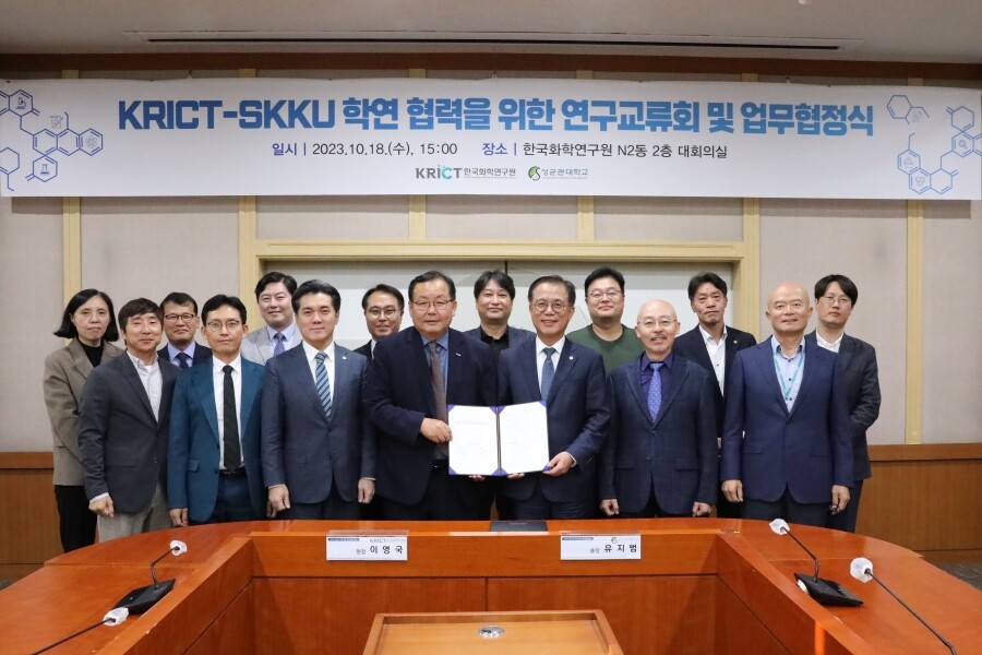 성균관대와 한국화학연구원은 성균관대 유지범 총장, 유필진 기획조정처장, 김태성 공과대학장, 한국화학연구원 이영국 원장 및 화학연 부원장, 연구본부장 등 14명의 주요 관계자가 참석한 가운데 연구교류회 및 업무협정 체결식을 개최했다.
