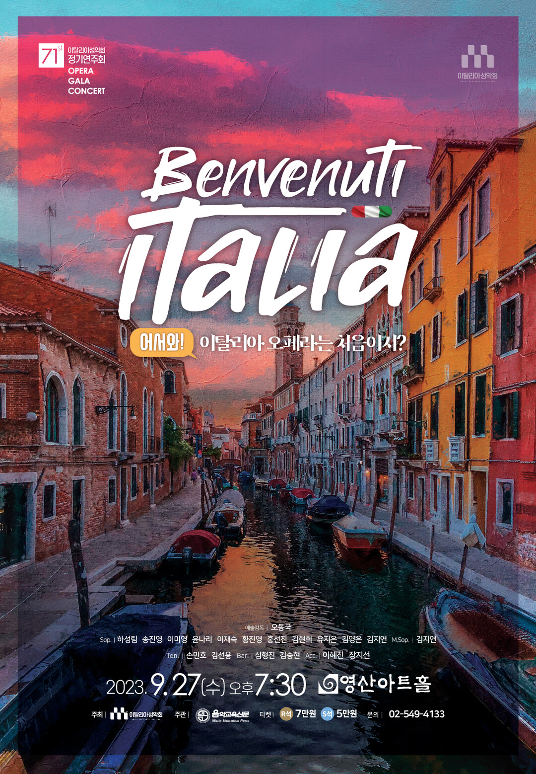 서울 영산아트홀에서 추석 연휴 전날인 27일 저녁 7시 30분 개막하는 제71회 이탈리아성악회 정기연주회 ‘Benvenuti Italia’는 '어서 와! 이탈리아 오페라는 처음이지?'라는 친절한 환영 인사 아래, W. A. Mozart, G. Donizetti, V. Bellini, G. Verdi, G. Puccini, P. Mascagni, F. Cilea의 이탈리아 오페라 작품 중 사랑에 대한 강렬한 열정과 비애를 담은 화려한 아리아와 듀엣, 중창을 선보일 예정이다.