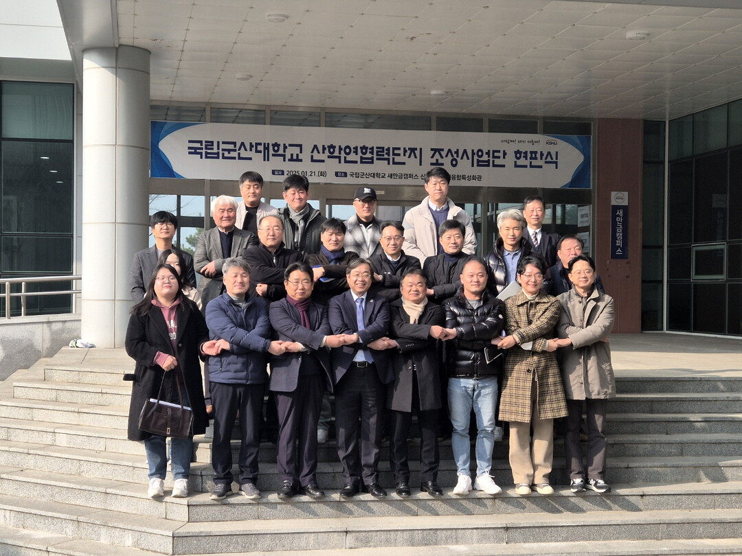 산학연협력단지조성사업단 현판식 참석자들이 기념촬영을 하고 있다. 사진=국립군산대 제공 |