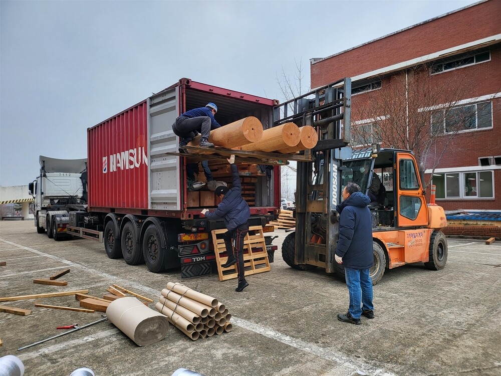 지난 10일 전북대가 필리핀에 건축할 한옥 자재들을 선적하고 있다. 사진=전북대 제공 |