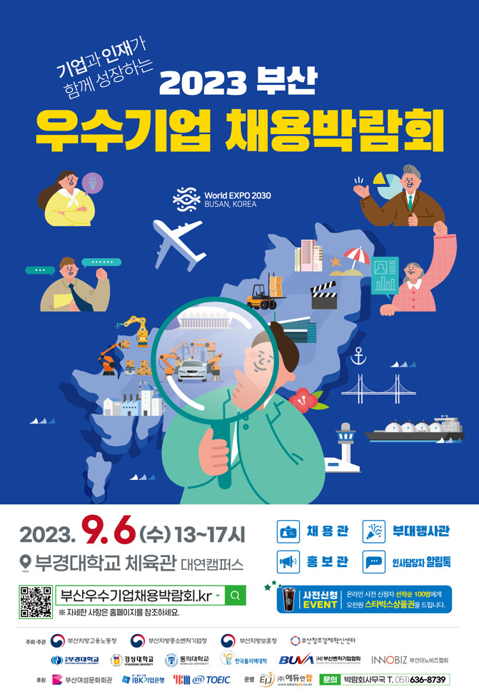 참가 희망자는 2023 부산 우수기업 채용박람회 홈페이지에서 사전 참가 신청하면 되고, 현장에서 참가신청서 접수 후 입장도 가능하다. 문의는 박람회 운영사무국으로 하면 된다.