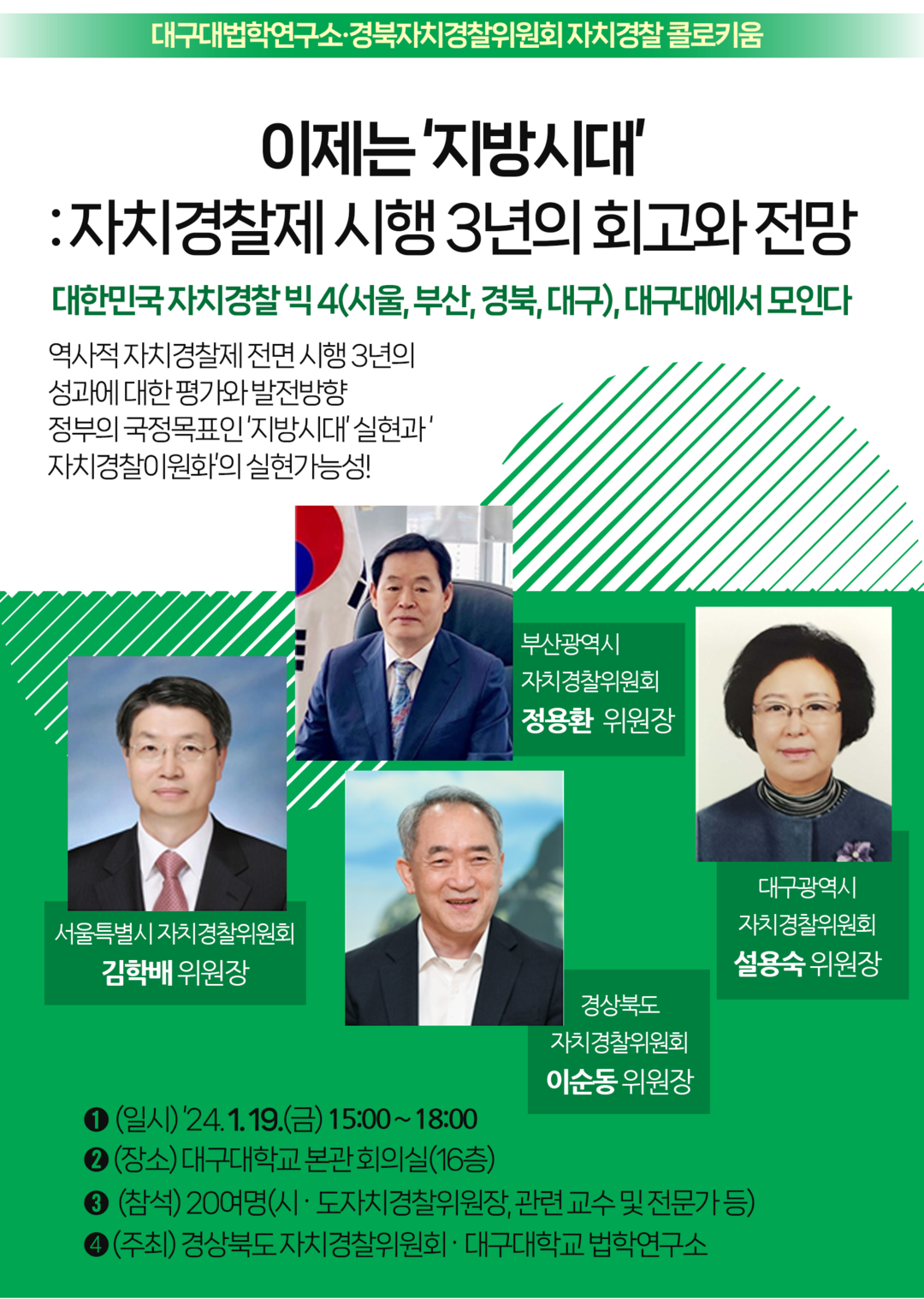 서울시, 부산시, 대구시, 경상북도의 자치경찰위원회 위원장들은 자치경찰위원회 초대 위원장으로서 임기 종료를 앞두고 대구대 법학연구소의 자치경찰 콜로키엄에 참석해 지난 3년 동안 추진해 온 각 지역의 특색있는 자치경찰 활동 성과를 점검한다.