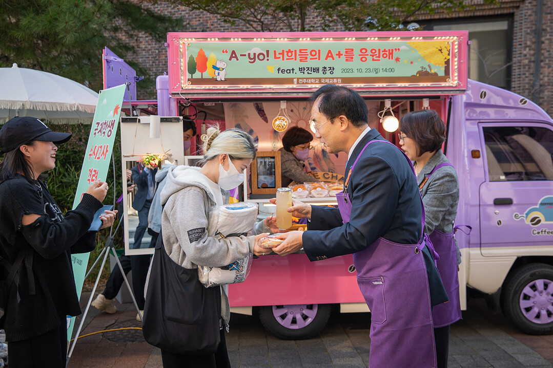 전주대 박진배 총장이 외국인 유학생에게 중간고사 응원 간식을 나눠주고 있다. 사진=전주대 제공