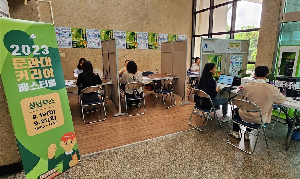 이벤트 부스는 문과 전공자의 취업역량 강화를 위해 ▲일대일 취업 상담 ▲해외 취업 ▲진로 타로 ▲퍼스널 컬러 등으로 구성됐다. 문과대학 출신 선배를 초청해 진로·취업 관련 궁금증을 해소해주는 멘토링과 문과대학 특성에 맞는 직무 선택·실전취업 노하우를 알려주는 대학일자리플러스센터 김연준 PM의 취업 특강도 진행됐다.