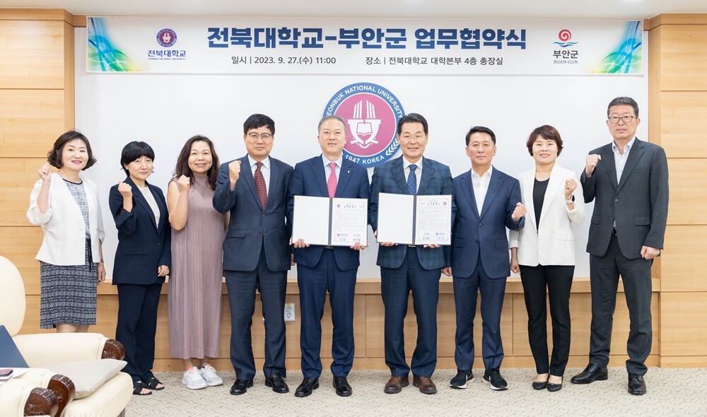전북대와 부안군이 글로컬대학30 사업 성공 등을 위한 업무협약을 27일 체결했다. 사진=전북대 제공