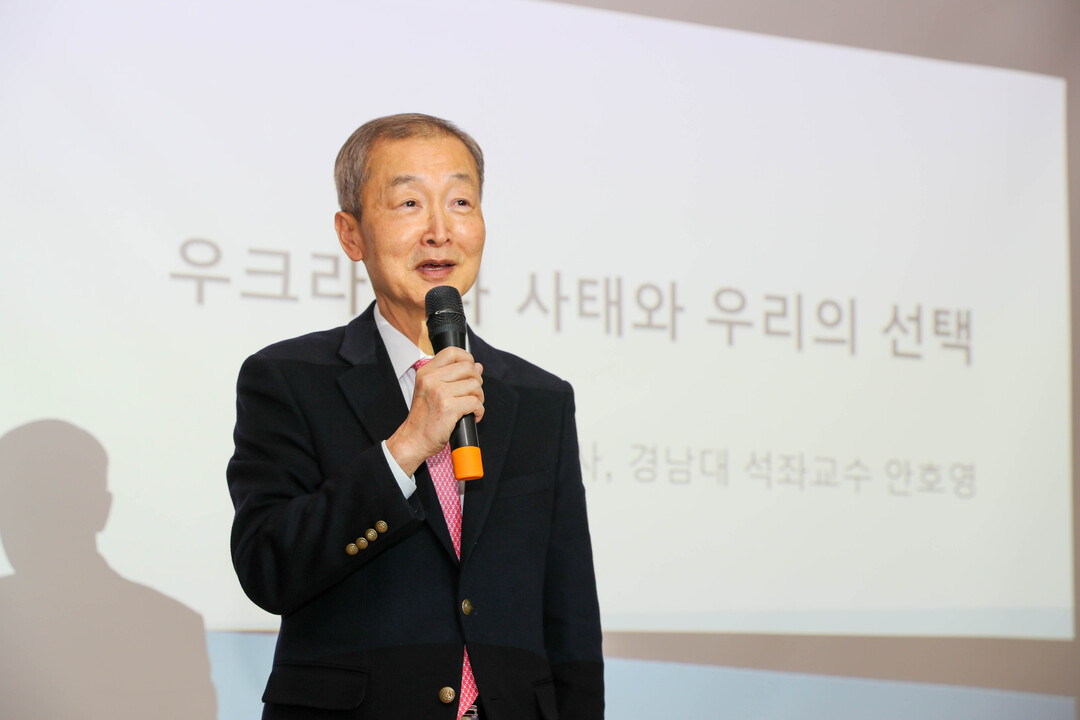 안 교수는 ‘우크라이나 사태와 우리의 선택’을 주제로 ▲이데올로기의 충돌 ▲국제적 긴장의 성격 ▲군사적, 외교적, 경제적 복합이기 등 동북아 긴장 고조와 더불어 한반도 정세 및 우리의 대응 방향에 대해 상세하게 설명하면서 원우들과 소통했다.